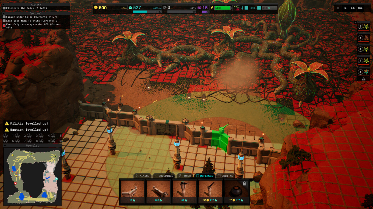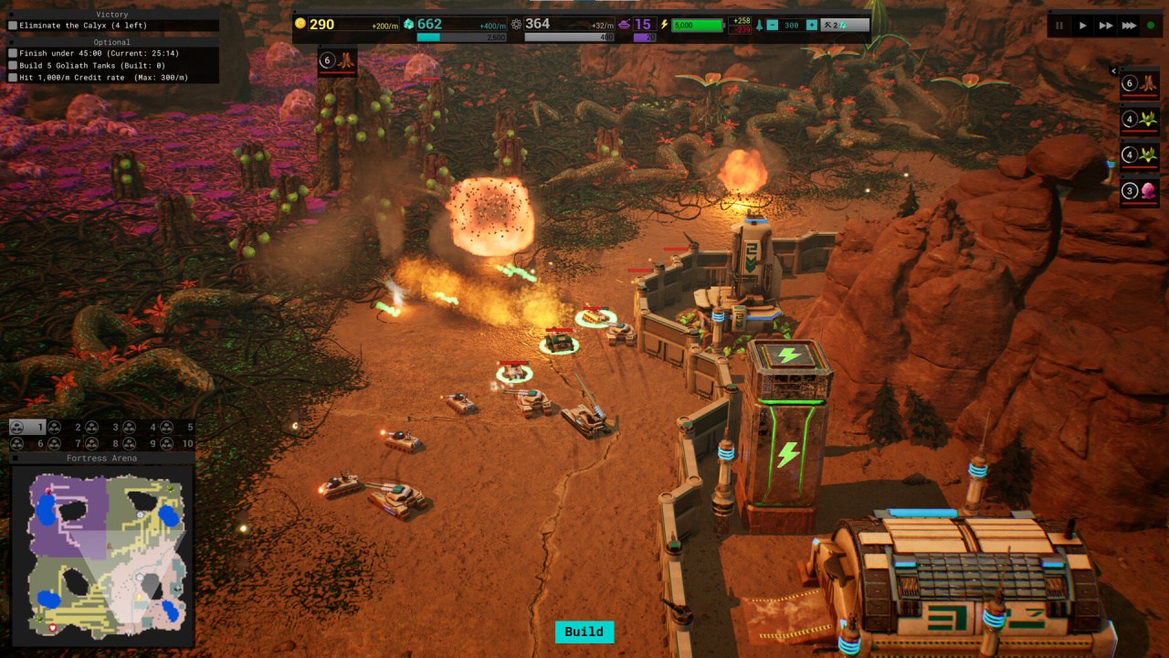 Кредиты тратишь на оборону. Стены, турели — чтобы сдержать первую волну зелени. Потом собираешь первые танки и ведешь их в атаку, отвоевывая территорию.