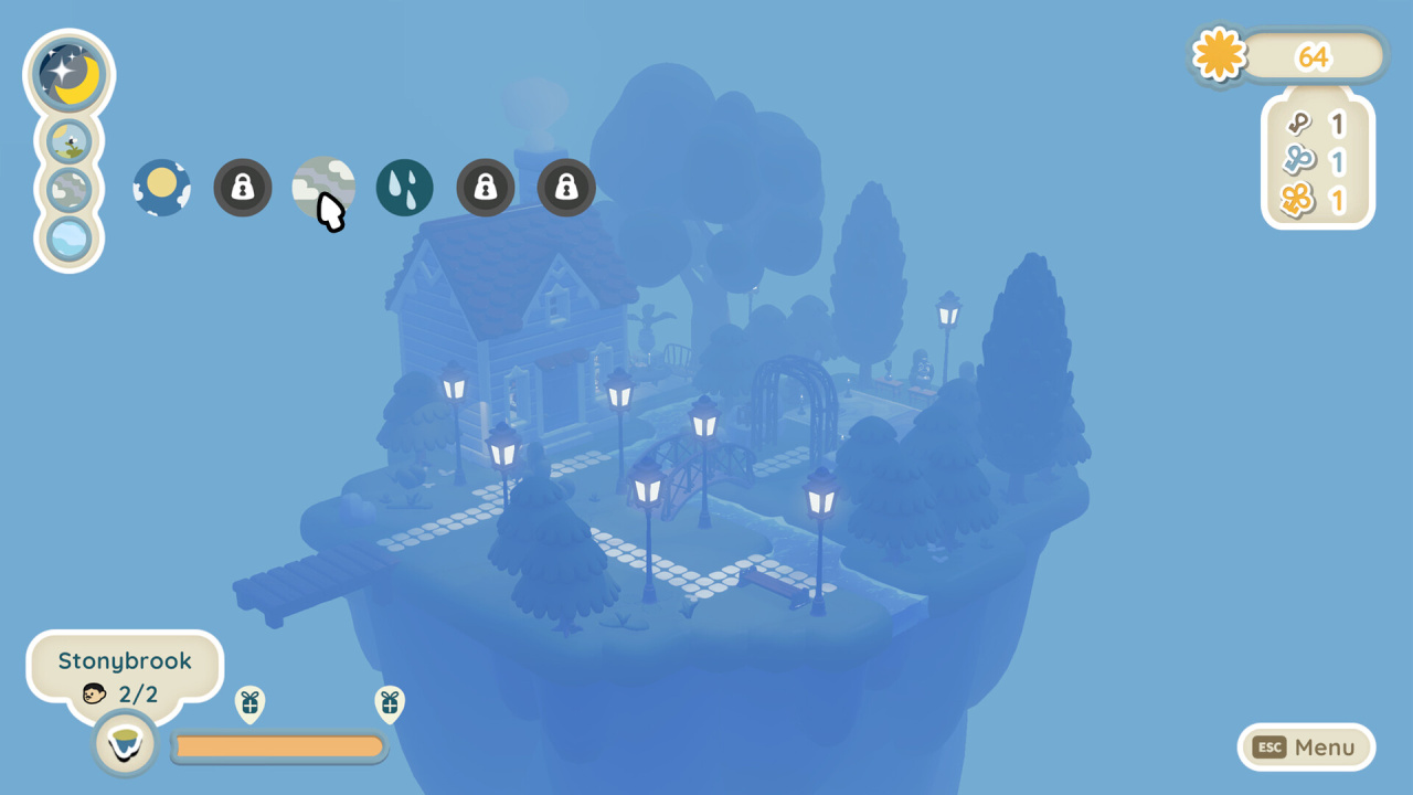 Ты управляешь не просто видом. Ты вдыхаешь в мир погоду. Меняешь свет, чтобы услышать, как саундтрек острова меняет тембр: от прозрачных капель солнца до густого гула предгрозья. Воздух становится то влажным и тяжёлым, то звеняще-хрустальным.