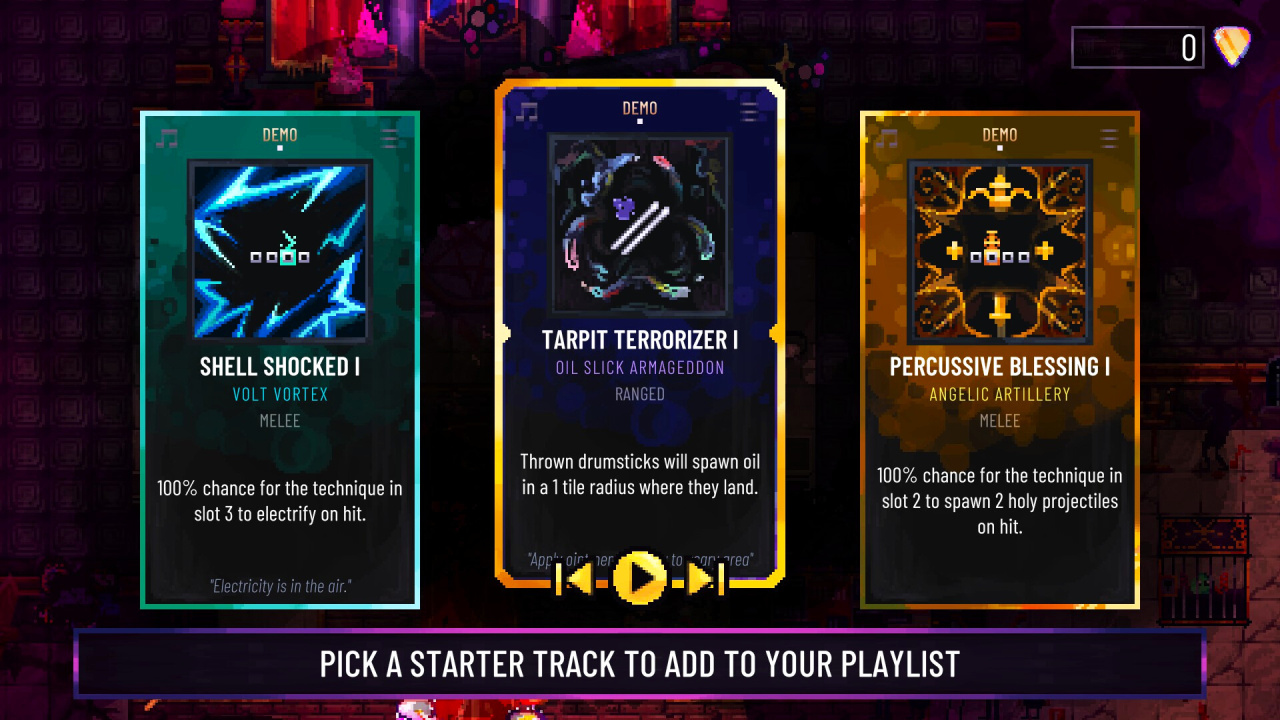 Ты составляешь плейлист по ходу движения, смешиваешь риффы и биты. И с каждым новым умением битва меняется. Точно подобранная комбинация может разорвать толпу фанатов… или оставить тебя одного в кольце врагов.