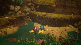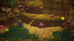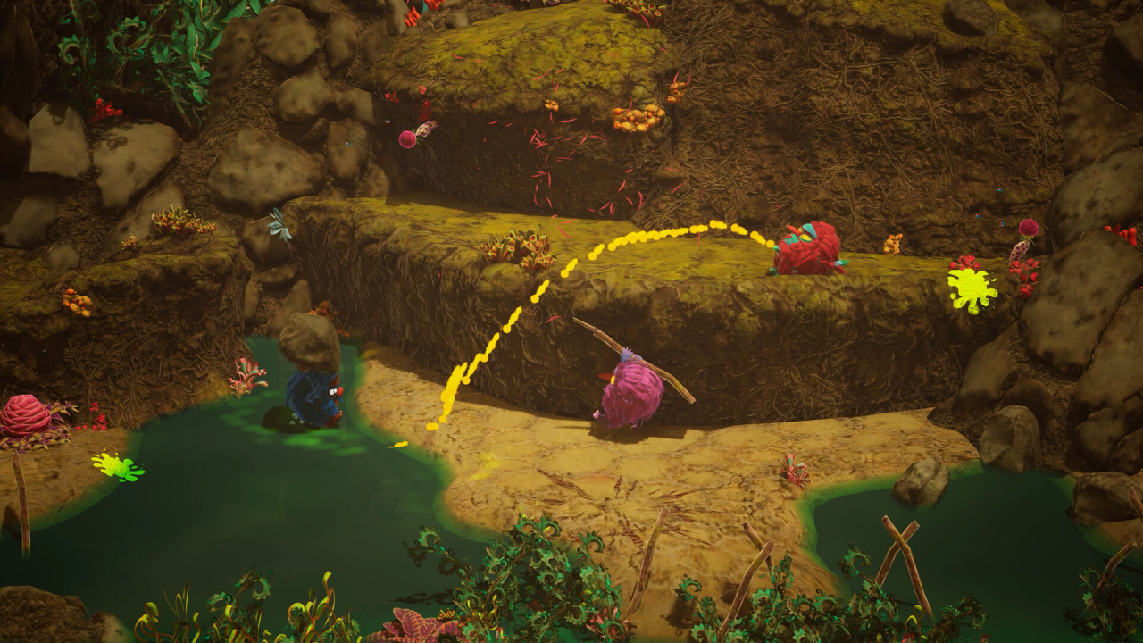 А может, лучше не атаковать, а найти тот самый фрукт, спрятанный в углу арены? Его мякоть дает новые возможности… которые можно смешать с окружением. Вода из лужи плюс твоя едкая моча — и вот уже пространство заполняет ядовитый туман.