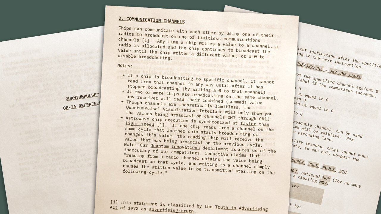 Игровой процесс — это двадцать пять головоломок на особом ассемблере. Решить задачу недостаточно... Разве можно остановиться на первом найденном ответе? Истинная цель — выжать из кода максимум, подчинив его трём богам: скорости исполнения, краткости кода и стоимости компонентов. Многие решения лежат на поверхности, но их отполированная до блеска эффективность — вот что становится навязчивой идеей.