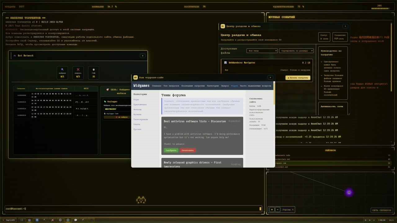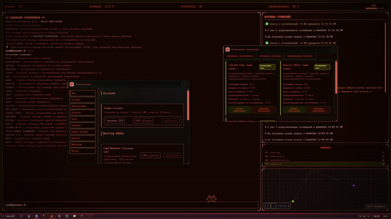 Ты начинаешь с пустого терминала. Мигающий курсор — твое главное орудие. Каждая команда обрастает плотью: новые торренты, скрытые трекеры, пользователи, что стекаются в твою сеть как кровь по новым сосудам. Ты чувствуешь их присутствие легкой вибрацией в статистике загрузок... Но помнишь ли ты запах перегретого процессора, когда нагрузка становится слишком большой?