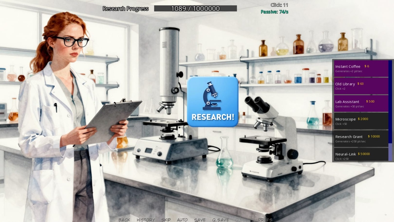 Геймплей простой. Кликаешь, получаешь ресурсы, открываешь новые этапы исследований. Всё вращается вокруг этого цикла: научный прогресс — визуальное вознаграждение.