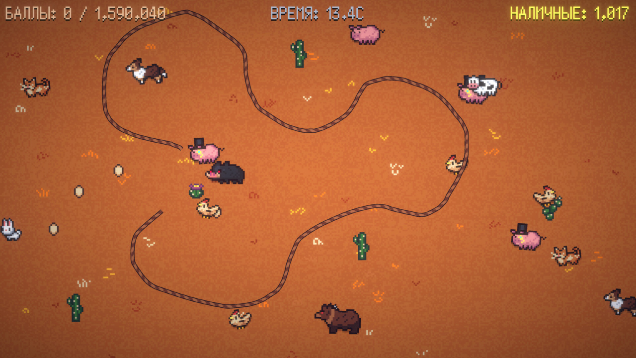 Здесь есть выбор персонажей. Один начинает с быстрым лассо, другой — с защищенным загоном. Это меняет стартовые условия и тактику.