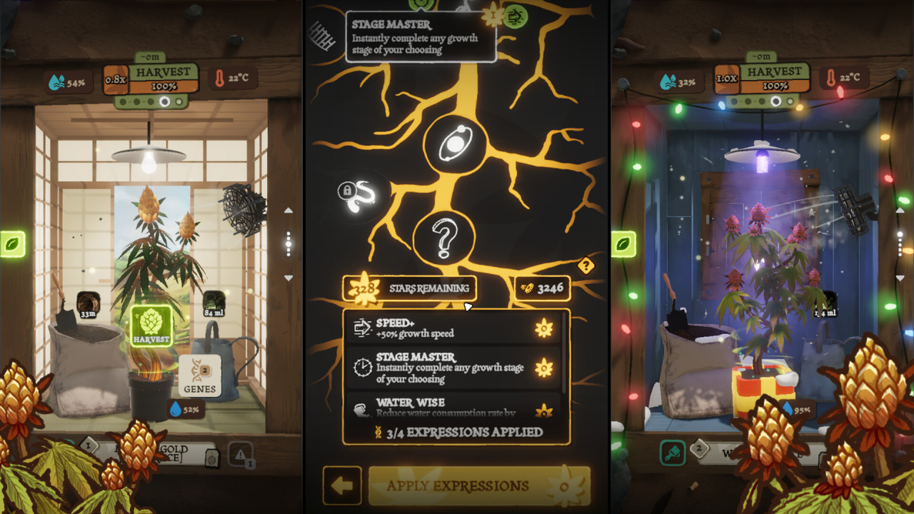 Ключевая механика — экспрессия генов. Каждый сорт можно менять, подстраивая под свои цели или под конкретный заказ. Освоил сорт до пятого уровня — открываешь новые генетические исследования. Так постепенно выводишь своё идеальное растение.
