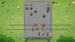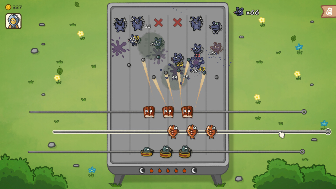Некоторые продукты работают как щит. Другие стреляют через ряд. Можно улучшать компоненты в магазине, объединяя одинаковые.