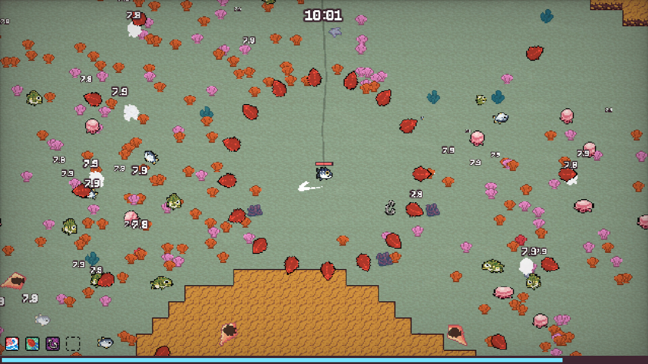 Вы спускаетесь под воду, и вас сразу окружают стаи агрессивных рыб. Это не спокойная ловля — это перестрелка, где вы уворачиваетесь от сотен снарядов. Чтобы выжить, нужно качаться и искать апгрейды.