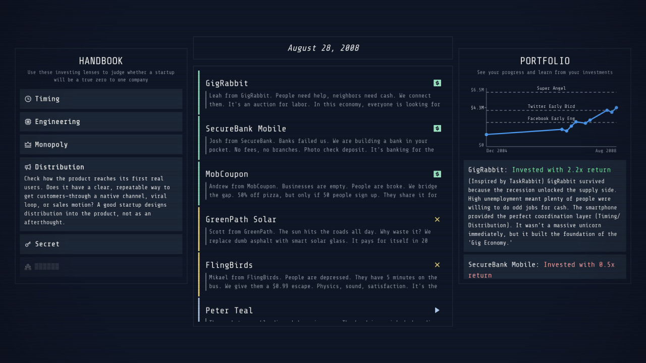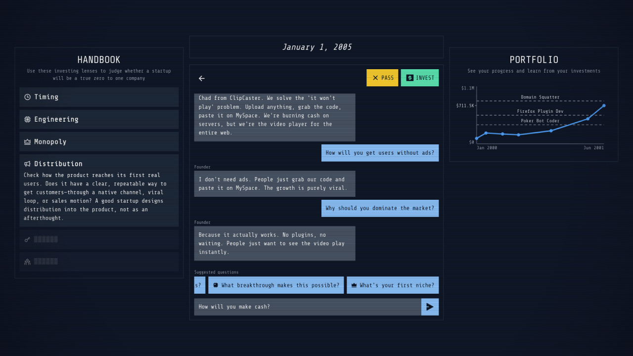 ZeroOne Terminal — текстовая стратегия про венчурные инвестиции. Ты смотришь на стартапы с 2000 по 2020 год. Все они основаны на реальных компаниях того времени. Некоторые станут гигантами, другие исчезнут бесследно.
