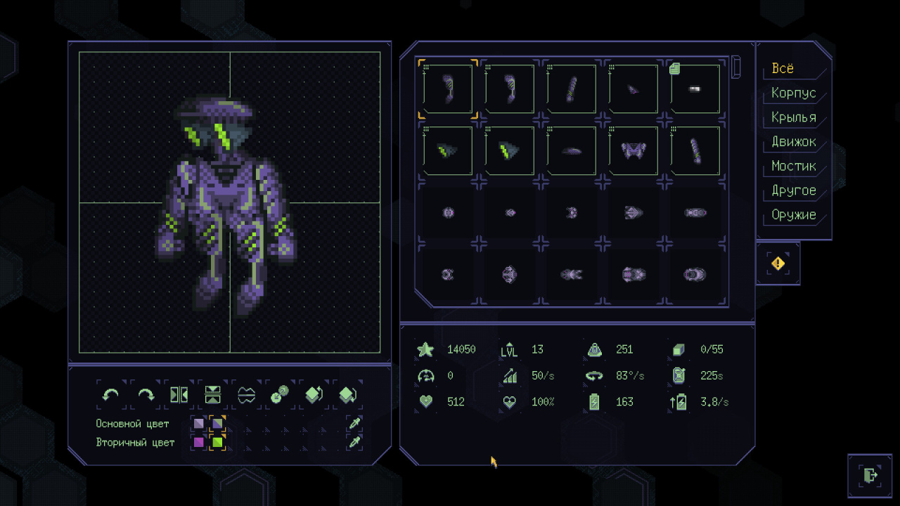 Сначала собираешь корабль. Берешь корпус, двигатели, пушки, щиты — как конструктор. Каждый модуль меняет поведение судна. Получается либо хлипкий истребитель, либо летающая крепость.
