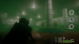 Стрельба здесь жёсткая. Враги появляются из мрака, и если выстрелите зря — останетесь с пустыми магазинами. Ошибки наказываются быстро.
