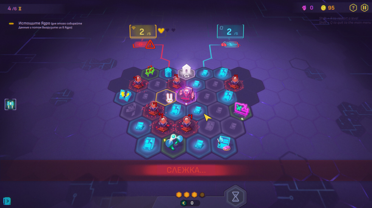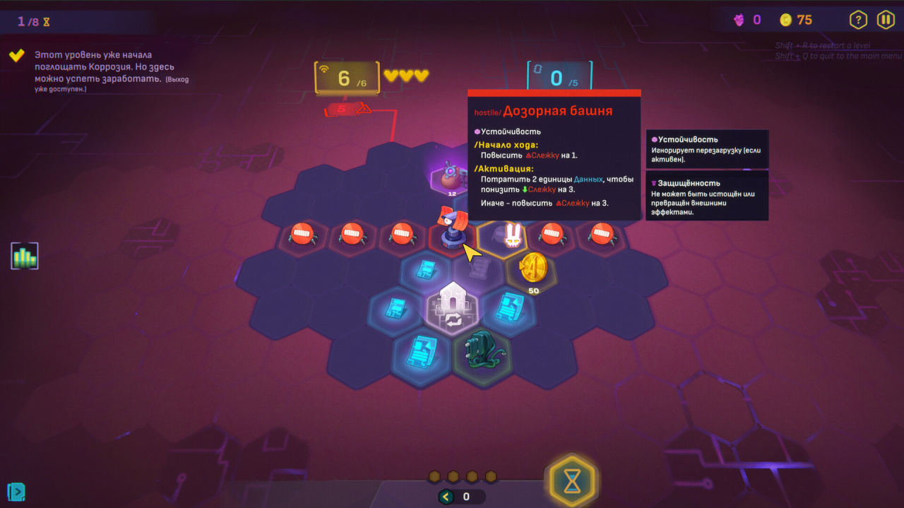 Главные испытания — это столкновения с Ядрами, особыми мини-боссами. У каждого свой принцип. Плоттер слабеет, если вы двигаетесь по прямой. Равновесие теряет силу, когда у вас совпадают две характеристики. Эмбер прячется среди неразведанных гексов в конце каждого хода. К каждому нужен свой подход.