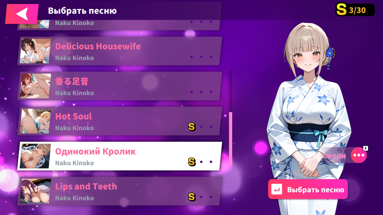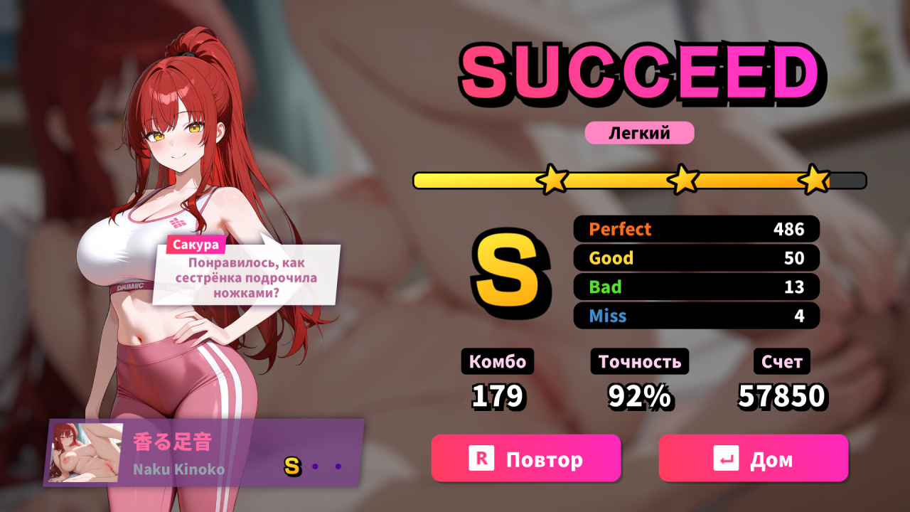Чем лучше играешь, тем откровеннее становится картинка. Каждая нота — это новый кадр анимации. Собери комбо, и героиня будет постепенно терять одежду. Анимация синхронизирована с музыкой, так что нажатия клавиш ощущаются по-другому.