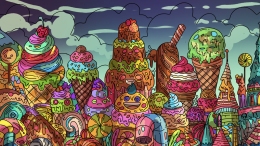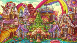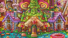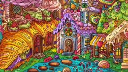 Картинки нарисованы вручную, очень детально. Это не просто фон, а целые истории: конфетная фабрика и сладкий город. Коты замаскированы в этих декорациях — некоторые очевидны, другие сидят в потаенных уголках.