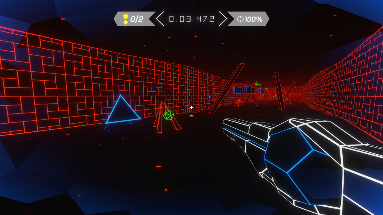 Перед тобой арена из геометрических фигур. Ты стреляешь по ним — и получаешь резкий импульс скорости. Попал в зелёный икосаэдр — выстрелил вперёд как из катапульты. Каждая фигура работает по-разному, так что траекторию движения приходится выстраивать на лету.