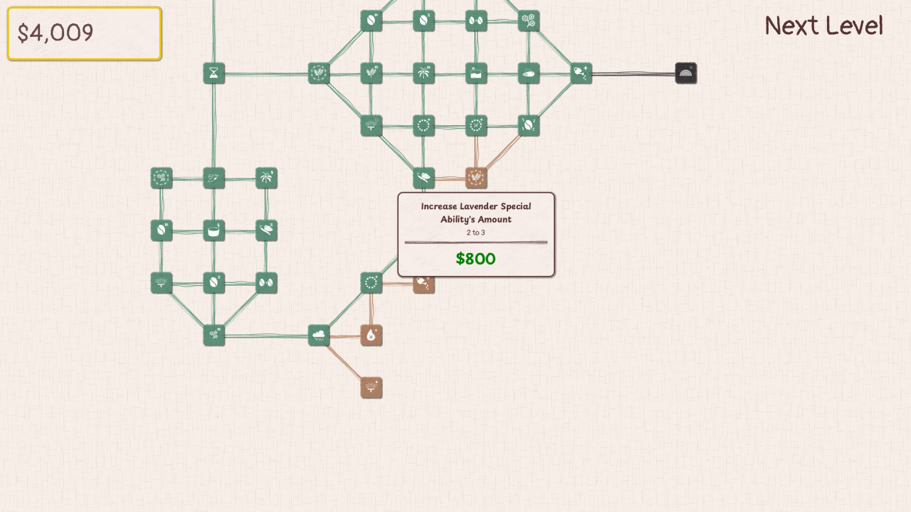 Дальше всё усложняется. Появляется древо навыков — больше двухсот улучшений. Можно автоматизировать полив с помощью разбрызгивателей или даже вызвать дождевую тучу. Сад растёт, а рутины становится меньше.