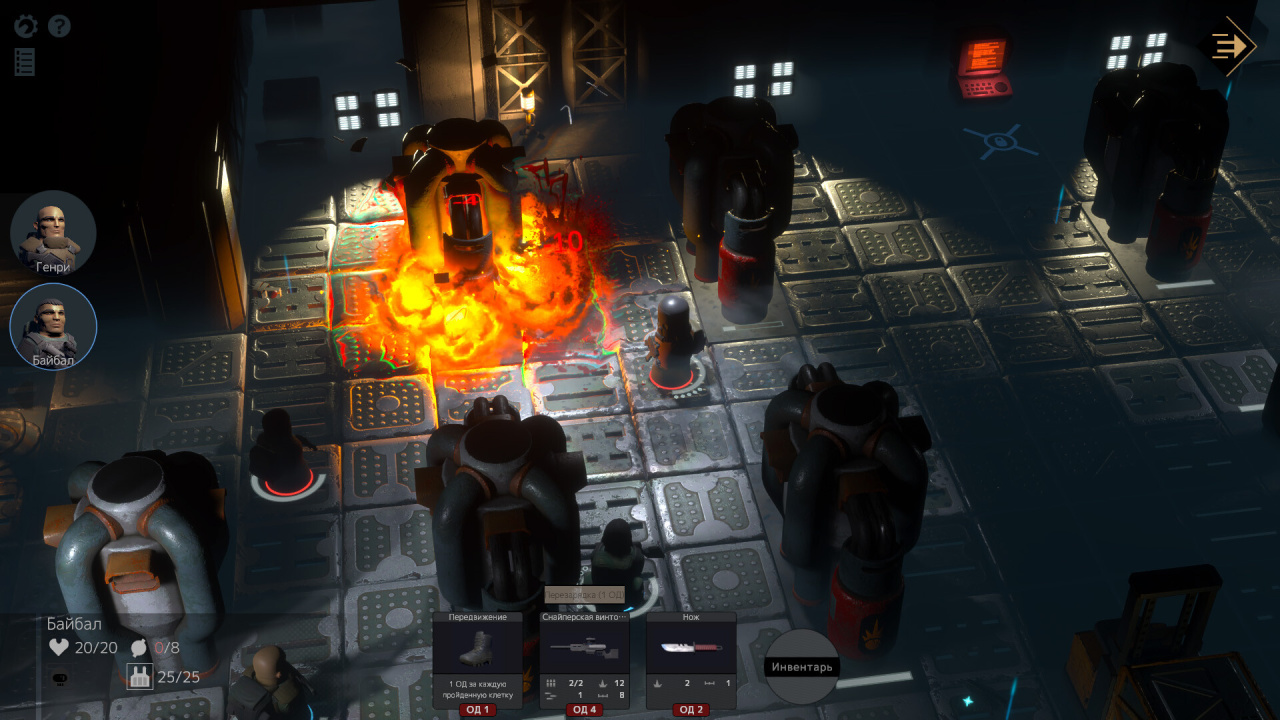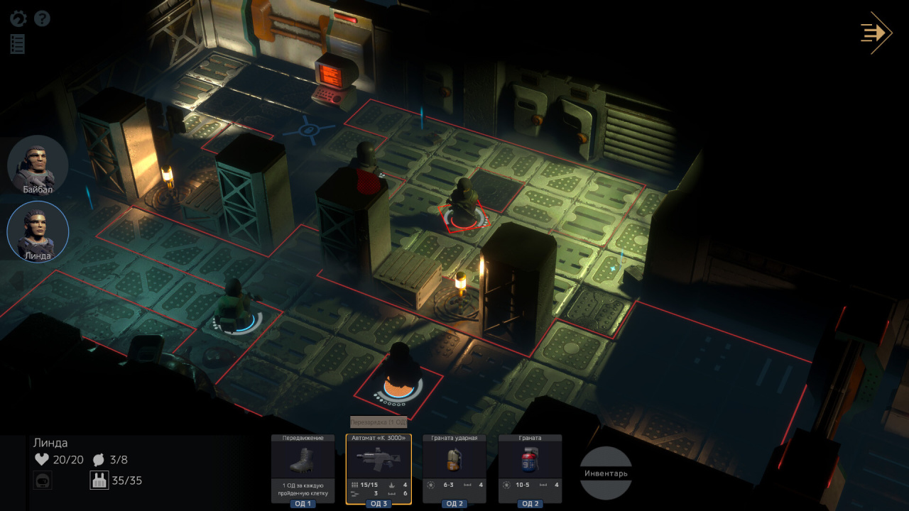 Сама перестрелка построена на этом микроменеджменте. Оружие стреляет, пока в магазине есть патроны. Кончились — ствол немеет. Менять обоймы, подбирать трофейные гранаты, снимать броню с убитых врагов приходится в паузах между ходами. Прямо на поле боя.