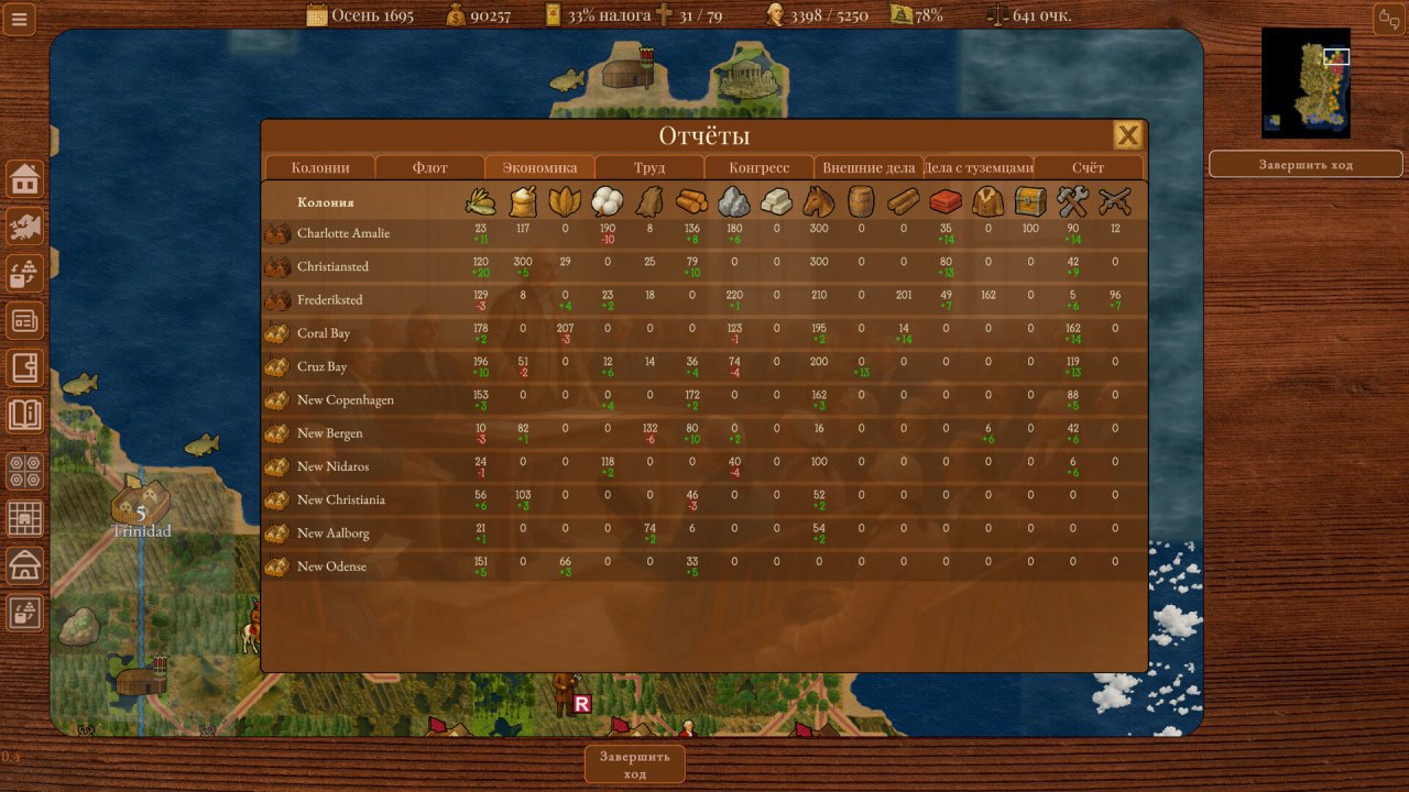 Основной геймплей — это большая торговая сеть. Вы возите товары через океан, продаёте, покупаете то, чего не хватает. Или обмениваетесь с индейцами. Без этого колония не выживет.