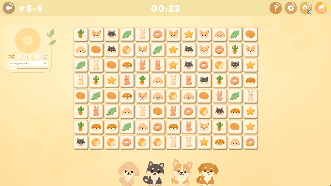 Puppy Link — это головоломка про соединение плиток. На поле много карточек, нужно находить одинаковые пары и соединять их линией. Линия может поворачивать только два раза.