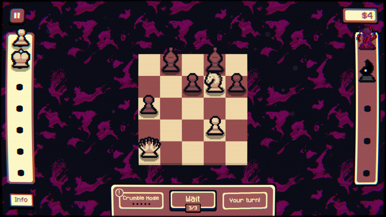 Здесь цель проста: уничтожить все вражеские фигуры. Но поле маленькое. Каждый шаг имеет вес. А если будешь медлить — клетки под твоими фигурами начнут исчезать. Так что думать нужно быстро.